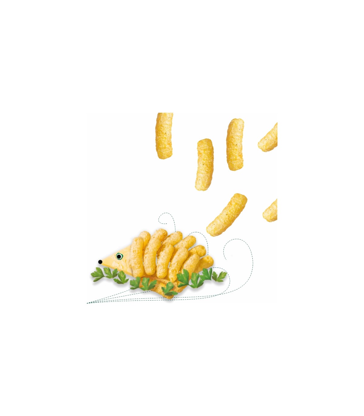 Acest snack usor si crocant este ideal in deplasari. Este copt, nu prajit, plin de aroma (acoperit cu pudra de branza si patrunjel) pentru papilele gustative in formare.