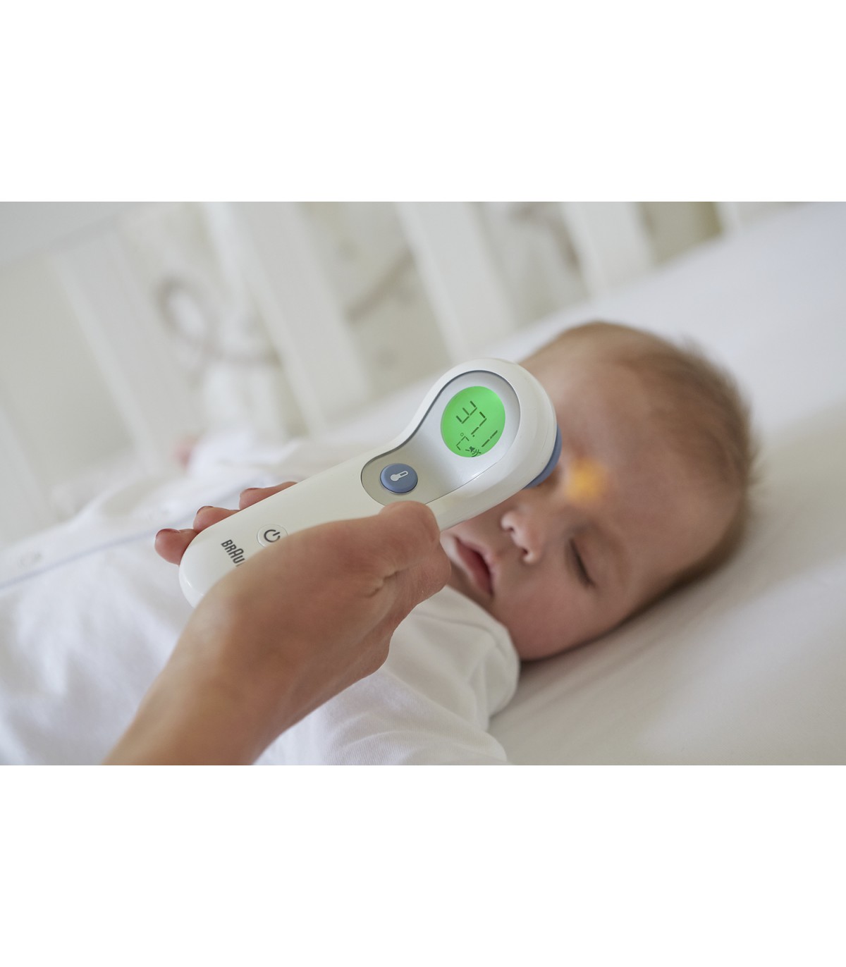 Primul termometru avand doua optiuni de masurare a caror acuratete a fost demonstrata clinic: metoda complet neinvaziva fara contact si metoda cu contact. Potrivit si in cazul copilului care doarme. Beneficiati de aceeasi acuratete profesionala indiferent daca atingeti fruntea copilului dumneavoastra sau tineti termometrul pana la o distanta maxima de 5 centimetri fata de frunte.