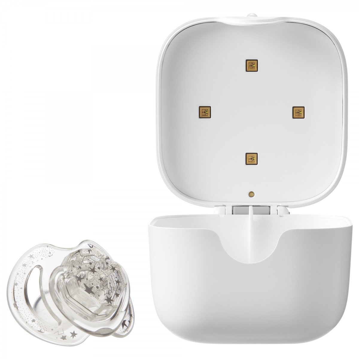 Pachetul contine: Sterilizator UV portabil pentru suzete, suzeta, cablu USB si manual de instructiuni.
