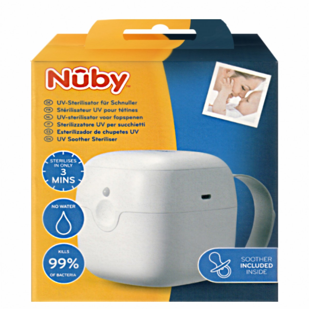 Nuby sterilizator UV portabil este o combinatie intre mai mai recenta tehnologie de sterilizare, stil si portabilitate. Ultilizand led-uri UV speciale, sterilizatorul actioneaza asupra ADN-ului microorganismelor distrugandu-le si prevenind proliferarea acestora (fiind astfel o alternativa mai sigura decat traditionala metoda de sterilizare la abur).