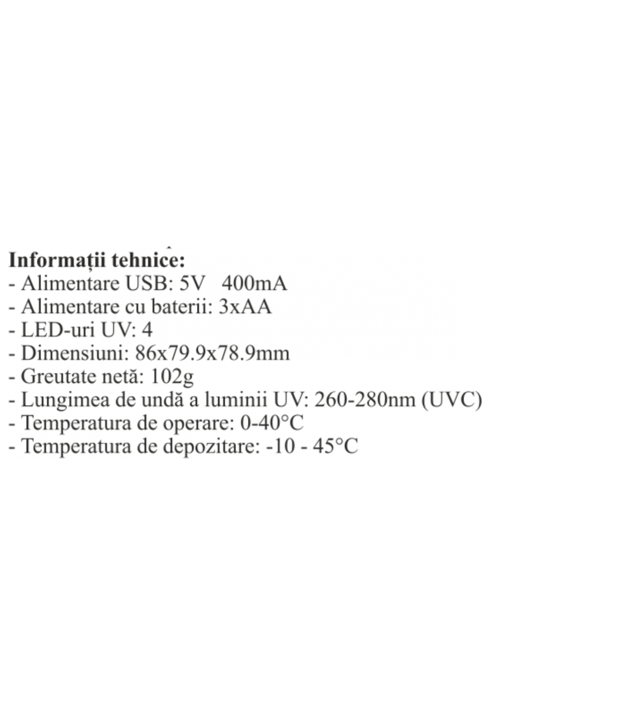 Atentie: Produsul este furnizat cu un cablu USB pentru alimentare. Daca este nevoie de un cablu alternativ, asigurati-va ca are aceeasi putere ca si cablul furnizat in pachet. Utilizarea unui cablu de putere gresita poate deteriora aparatul sau il poate opri sa functioneze asa cum este prezentat. Nu priviti direct in lumina UV deoarece acest lucru poate cauza discomfort sau afectarea retinei in cazul unei expuneri prelungite.