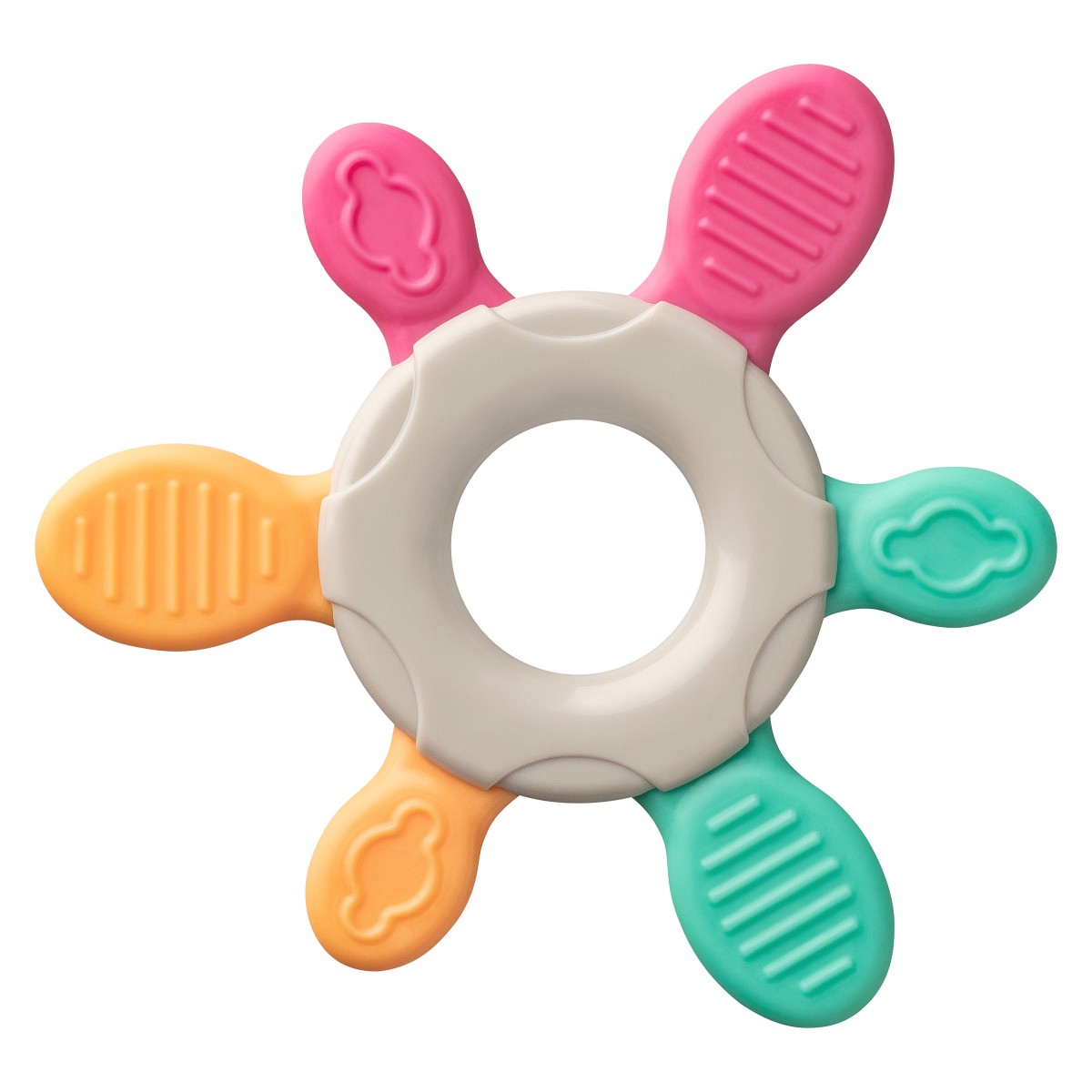 Diferitele suprafete moi texturate ale inelului pentru dentitie maseaza usor gingiile si pot ajuta la atenuarea durerii in timpul eruptilor dentare.