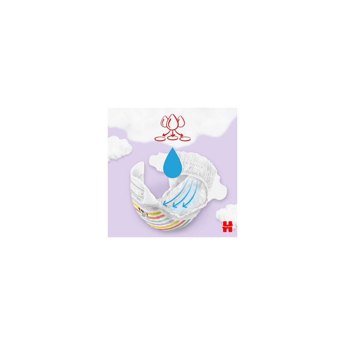 Stratul interior special conceput, cu canale super absorbante, absoarbe lichidul in cateva secunde si il distribuie uniform pe toata lungimea scutecului.
