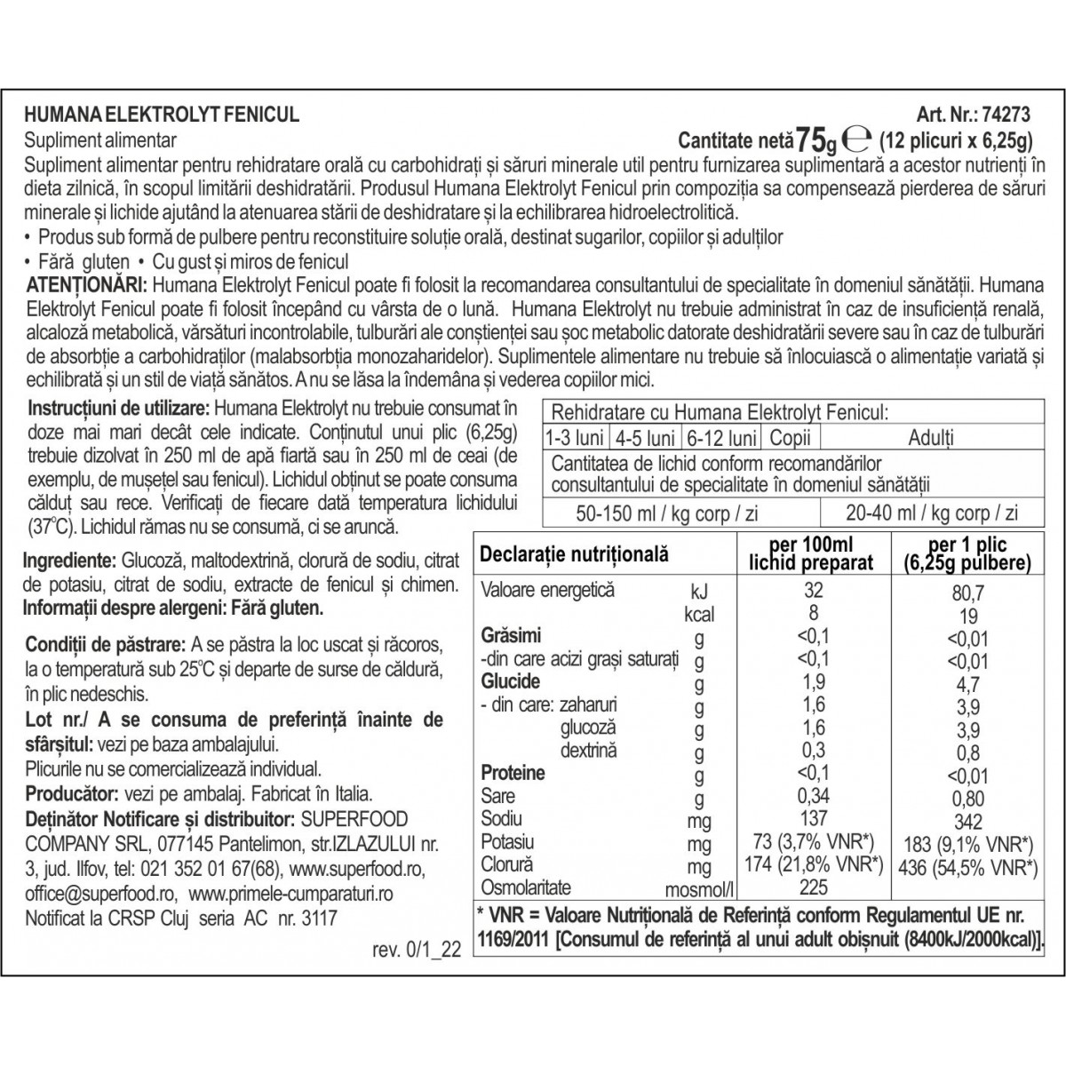 ATENTIONARI: Humana Elektrolyt Fenicul poate fi folosit la recomandarea consultantului de specialitate in domeniul sanatatii. Humana Elektrolyt Fenicul poate fi folosit incepand cu varsta de o luna. Humana Elektrolyt nu trebuie administrat in caz de insuficienta renala, alcaloza metabolica, varsaturi incontrolabile, tulburari ale constientei sau soc metabolic datorate deshidratarii severe sau in caz de tulburari de absorbtie a carbohidratilor (malabsorbtia monozaharidelor). Suplimentele alimentare nu trebuie sa inlocuiasca o alimentatie variata si echilibrata si un stil de viata sanatos. A nu se lasa la indemana si vederea copiilor mici.