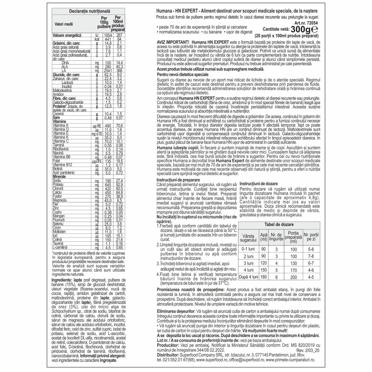 AVIZ IMPORTANT! Humana HN EXPERT este o formulă bazată pe proteine din lapte de vacă, de aceea nu este potrivită în alimentația sugarilor cu alergie la proteinele din laptele de vacă, intoleranță la lactoză sau tulburări ale metabolismului glucozei și galactozei. Potrivit ca unică sursă de alimentație încă de la naștere, iar începând cu vârsta de 6 luni ca parte complementară de nutriție. Întotdeauna consultați medicul pediatru atunci când copilul suferă de diaree și atunci când simptomele persistă. Produsul nu este adecvat sugarilor prematuri. Produsul nu trebuie administrat pe cale parenterală.
