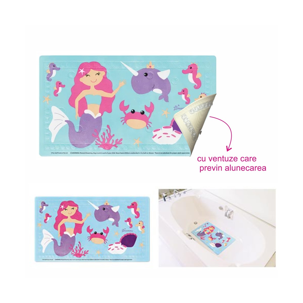 | AVERTISMENT: Preveniți înecul. Stați întotdeauna la o distanță de un braț de copilul dvs. atunci când este în cadă sau sub duș. Nu lăsați niciodată copiii nesupravegheați în cadă sau sub duș. Acest produs nu înlocuiește o supraveghere corespunzătoare a copilului din partea unui adult. Precauții: Ori de câte ori copilul intră sau iese din cada de baie, asigurați-vă că e susținut de un adult sau se ține de marginea căzii. Este indicat să se stea pe mijlocul covorașului. Întotdeauna când umpleți cada începeți cu apa rece și apoi adăugați apa caldă. Verificați întotdeauna temperatura apei cu mâna înainte de a pune copilul în cadă sau sub duș. A se evita contactul cu surse directe de căldură, cum ar fi caloriferele. A nu se folosi dacă prezintă orice semn de uzură sau degradare. |