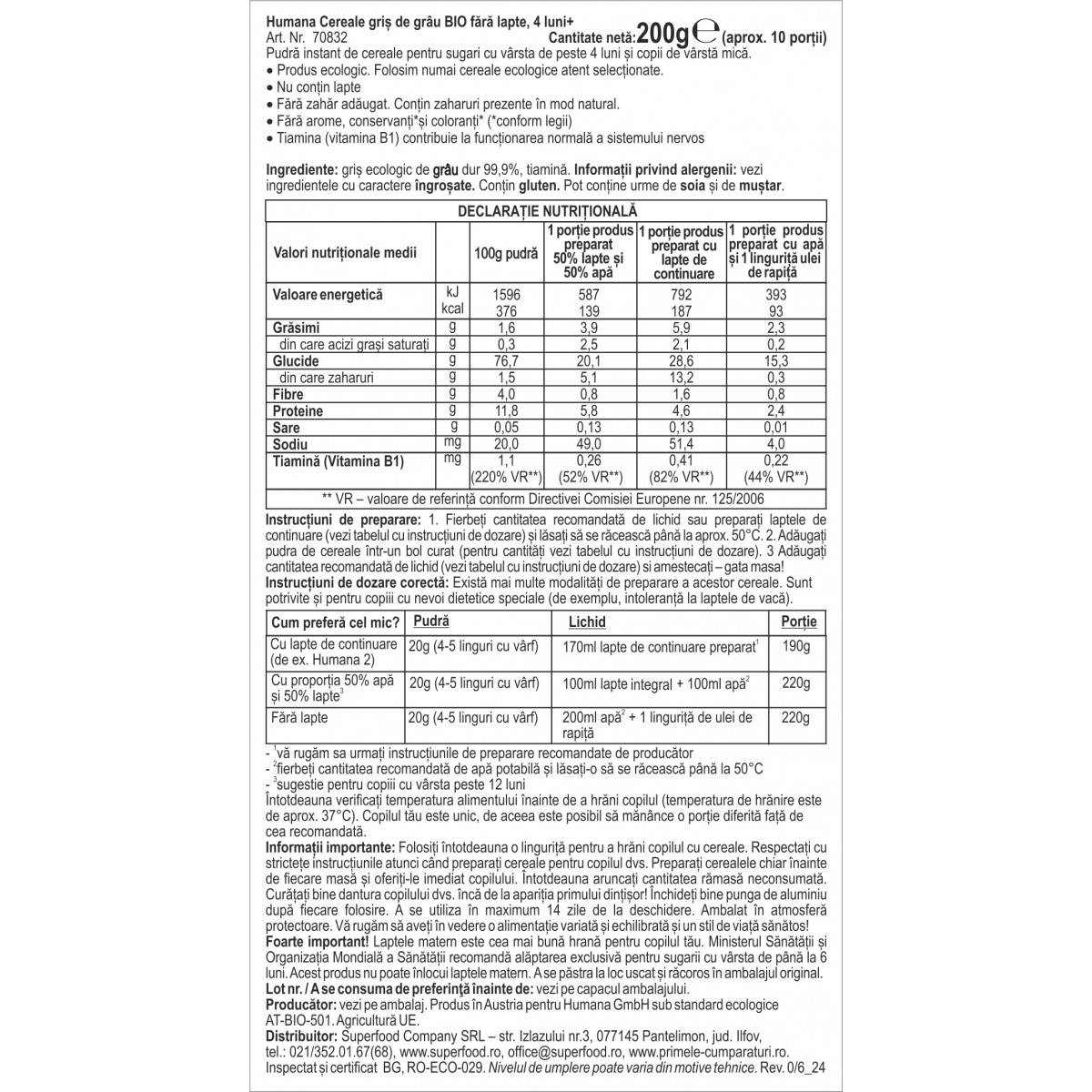 Humana BIO Cereale Gris de grau, fara lapte, 200g, 4luni+