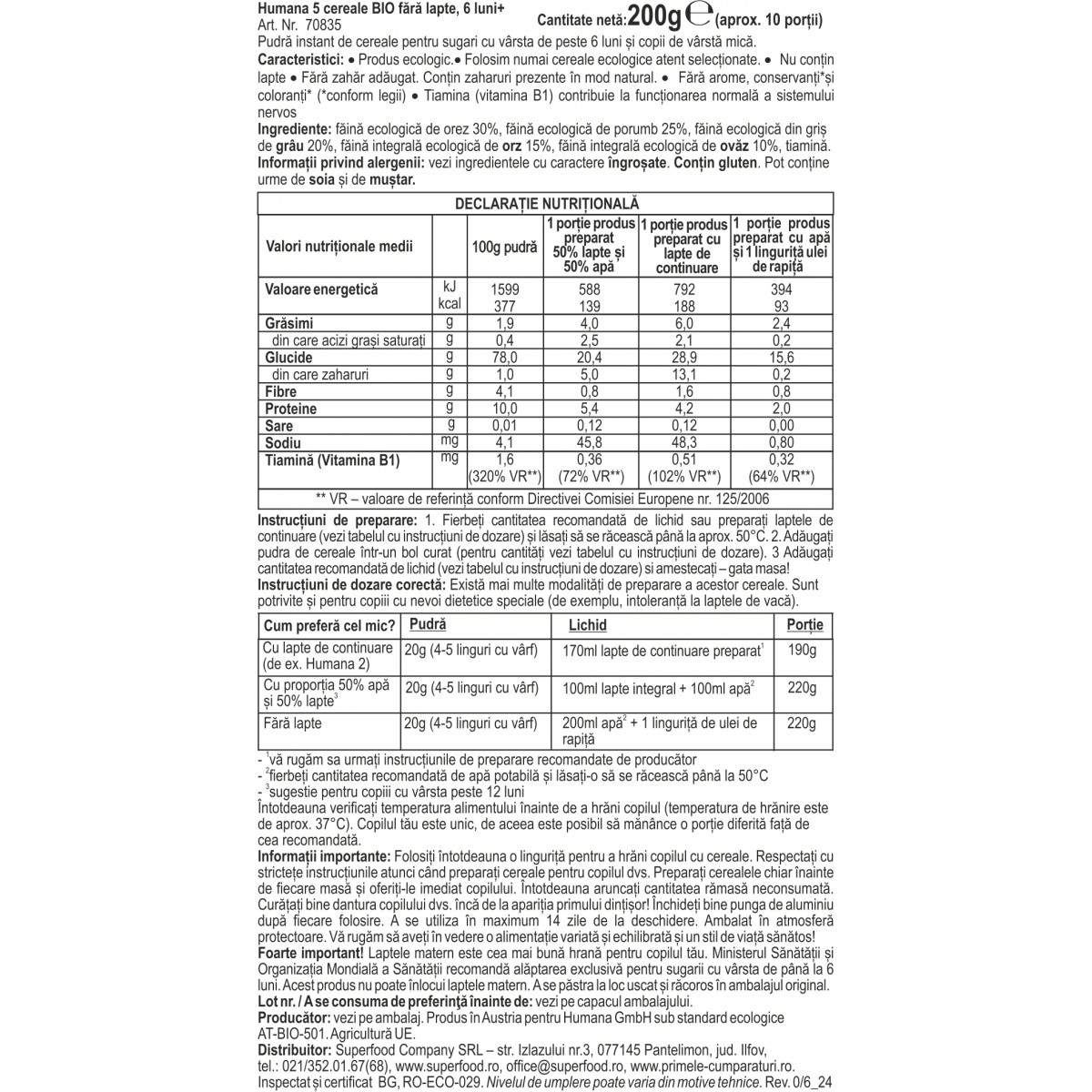 Instrucțiuni de preparare: 1. Fierbeți cantitatea recomandată de lichid sau preparați laptele de continuare (vezi tabelul cu instrucțiuni de dozare) și lăsați să se răcească până la aprox. 50°C. 2. Adăugați pudra de cereale într-un bol curat (pentru cantități vezi tabelul cu instrucțiuni de dozare). 3 Adăugați cantitatea recomandată de lichid (vezi tabelul cu instrucțiuni de dozare) si amestecați – gata masa!