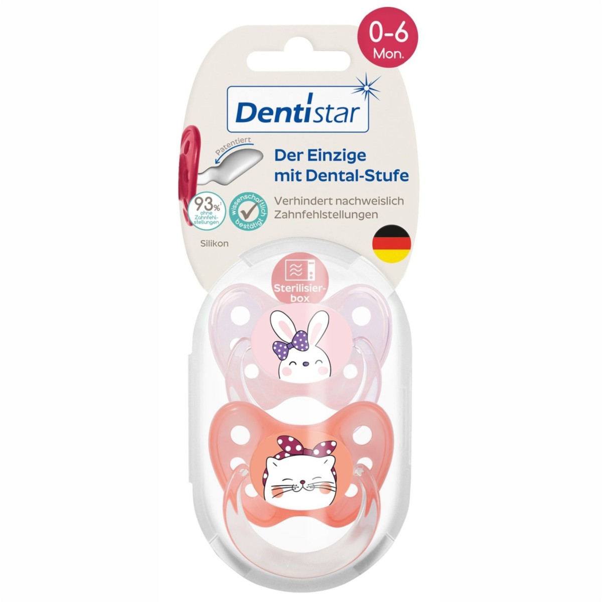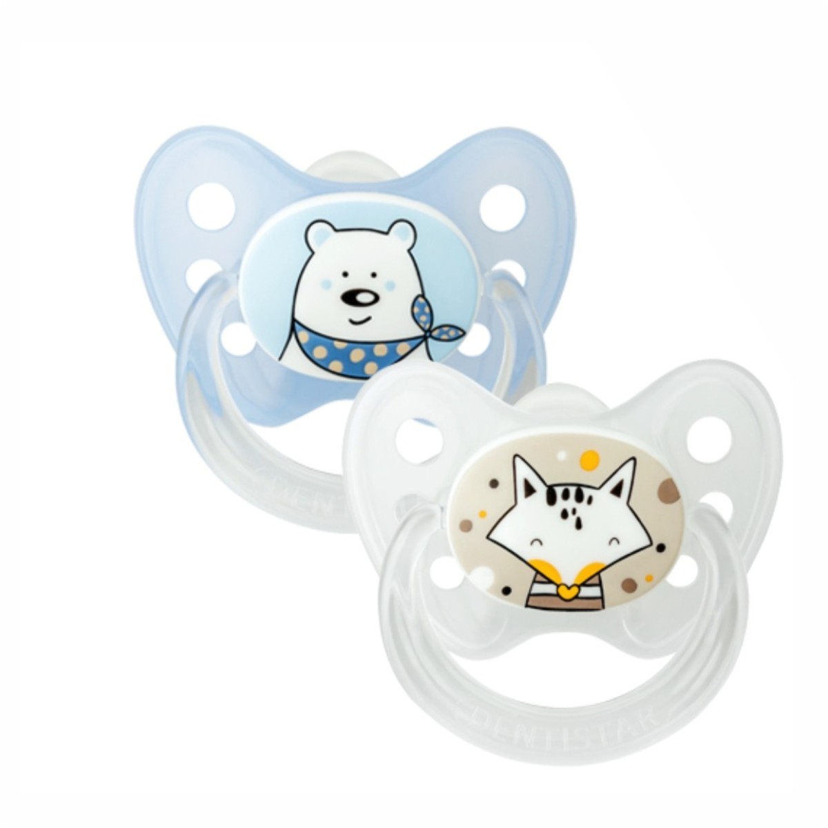 Dentistar – Set 2 suzete cu inel + cutie sterilizare, 0-6 luni
