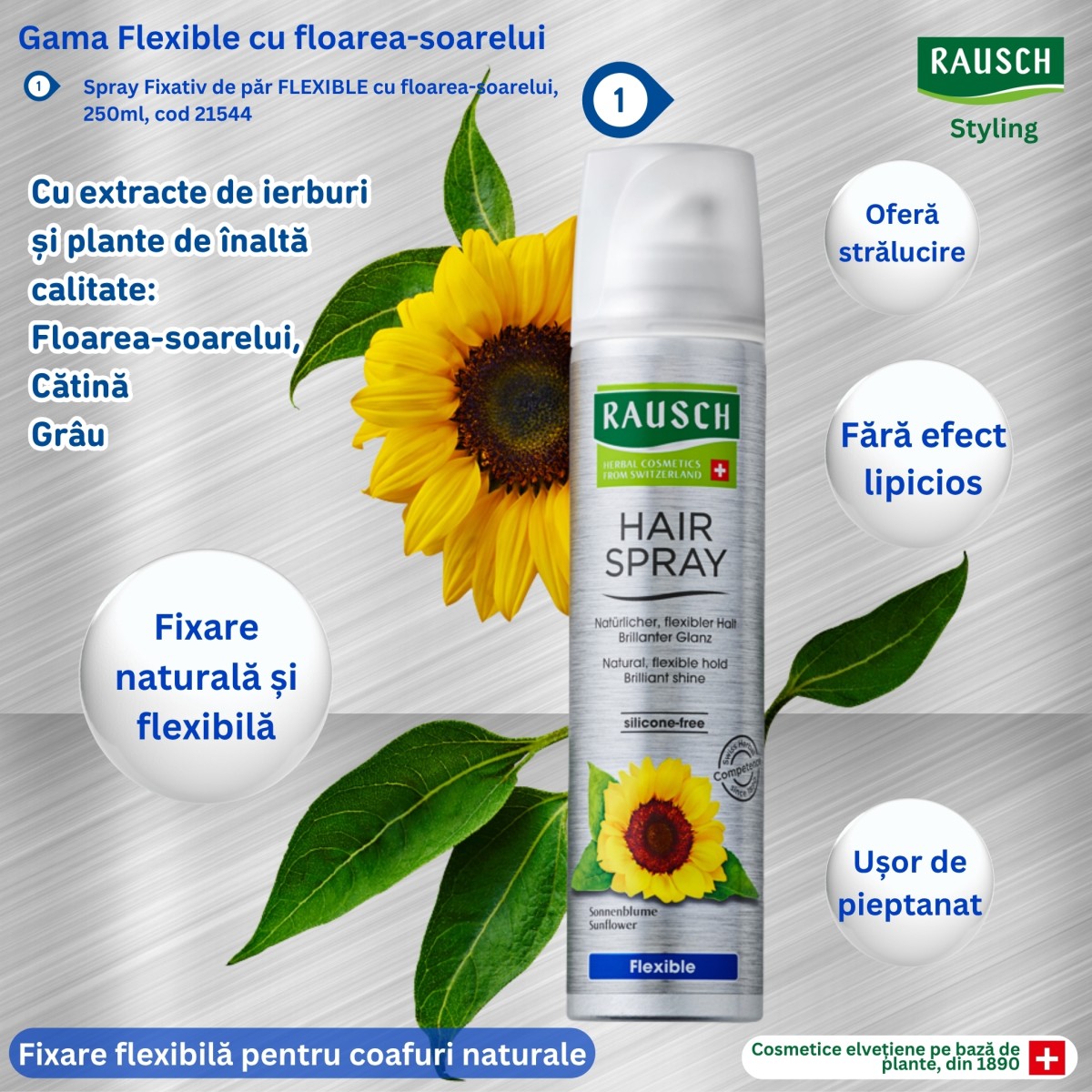 Rausch - Styling - Spray Fixativ de păr, FLEXIBLE, cu floarea-soarelui, 250ml