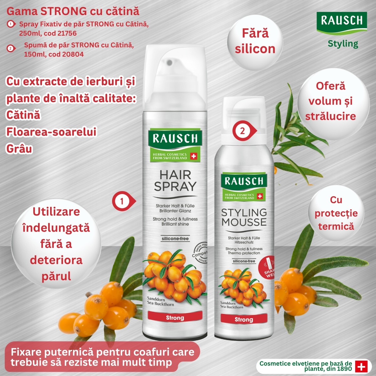 Rausch - Styling - Spray Fixativ de păr, STRONG, cu cătină, 250ml