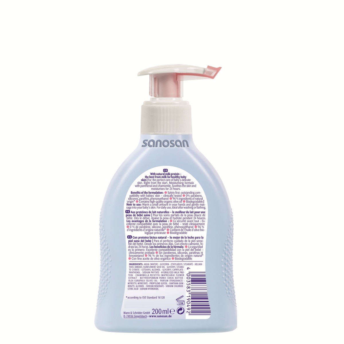 Ingrediente: AQUA (WATER) ∙ GLYCERIN ∙ ETHYLHEXYL STEARATE ∙ HELIANTHUS ANNUUS (SUNFLOWER) SEED OIL ∙ GLYCERYL STEARATE CITRATE ∙ CETEARYL ALCOHOL ∙ GLYCERYL CAPRYLATE ∙ PANTHENOL ∙ SODIUM PHYTATE ∙ HYDROLYZED MILK PROTEIN ∙ CHAMOMILLA RECUTITA (MATRICARIA) FLOWER EXTRACT ∙ BUTYROSPERMUM PARKII (SHEA) BUTTER ∙ OLEA EUROPAEA (OLIVE) FRUIT OIL ∙ PARFUM (FRAGRANCE) ∙ MYRISTYL MYRISTATE ∙ PROPYLENE GLYCOL ∙ XANTHAN GUM ∙ BENZYL ALCOHOL ∙ SODIUM BENZOATE ∙ SODIUM CHLORIDE ∙ CITRIC ACID ∙ SODIUM HYDROXIDE.