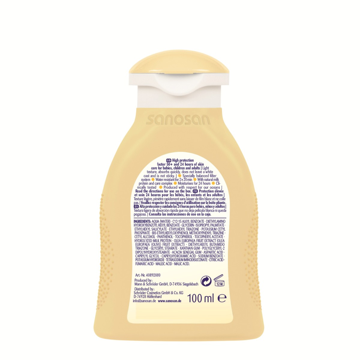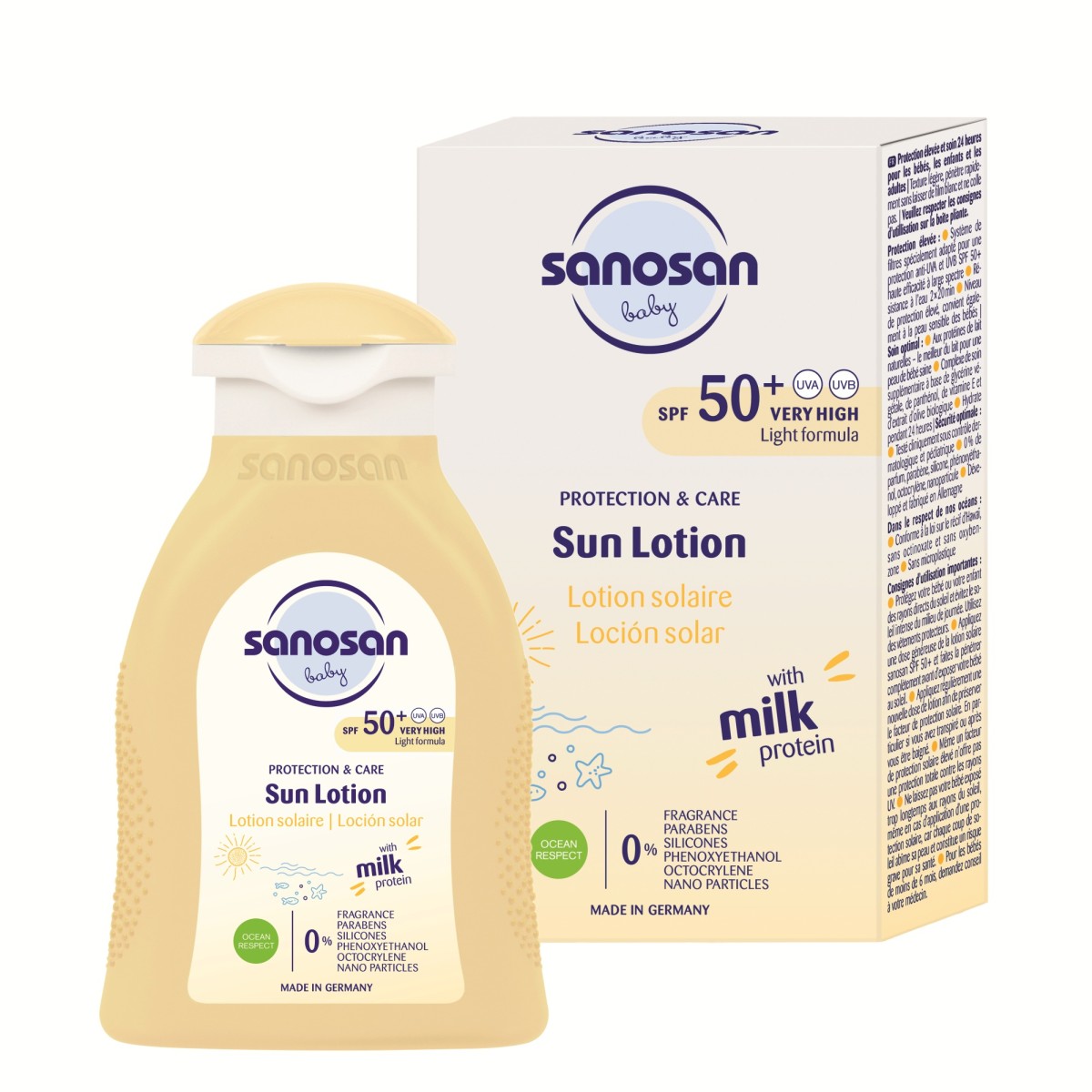 ☀ Aplicați din abundență loțiunea Sanosan cu SPF 50+ și lăsați-o să se absoarbă complet înainte de a expune bebelușul la soare