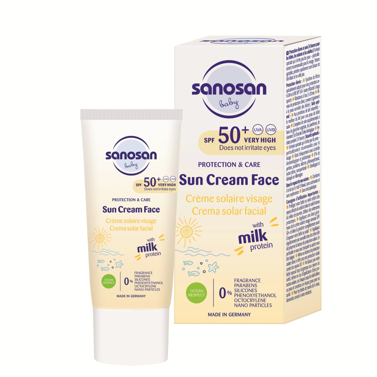 ☀ Aplicați din abundență pe fața copilului crema Sanosan cu SPF 50+ și lăsați-o să se absoarbă complet înainte de a-l expune la soare