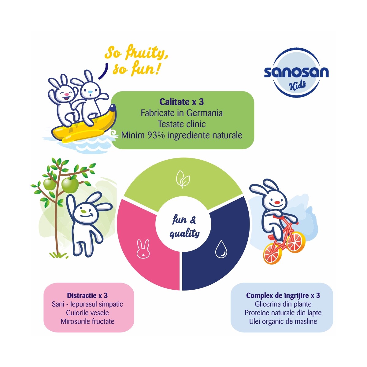 Datorită culorilor vesele și alături de Sani, iepurașul nostru simpatic, Sanosan transformă băița într-o mare distracție. Și miroase așa de bine... Copiii iubesc mirosul fructat de banană.