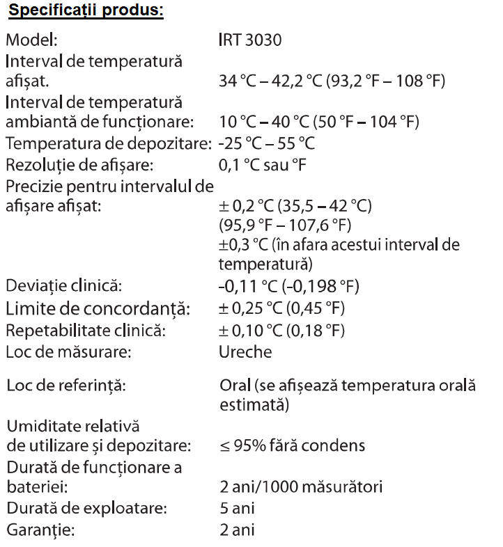 Pachetul conține: termometru auricular, capac de protecție, 21 capace igienice de unică folosință, baterie litiu de 3V.