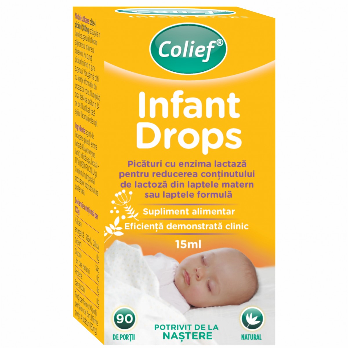 Ingredientul activ din Colief® Infant Drops este lactaza, o enzima care exista in mod natural in organism, aceasta reduce continutul de lactoza din laptele matern sau laptele formula.