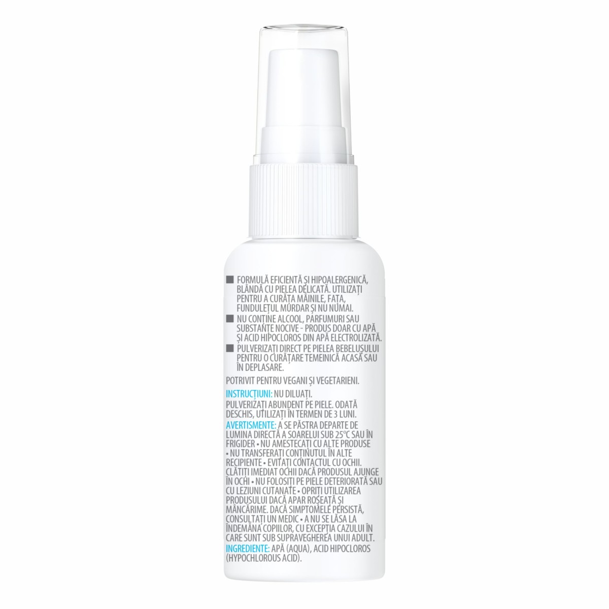 - Nu contine alcool, parfum, conservanti sau chimicale dure cum ar fi triclosan, clorura de benzalconiu (BAC), trietanolamina, parabeni, sulfati, ftalati, Sodium Laurel Sulphate, etc.