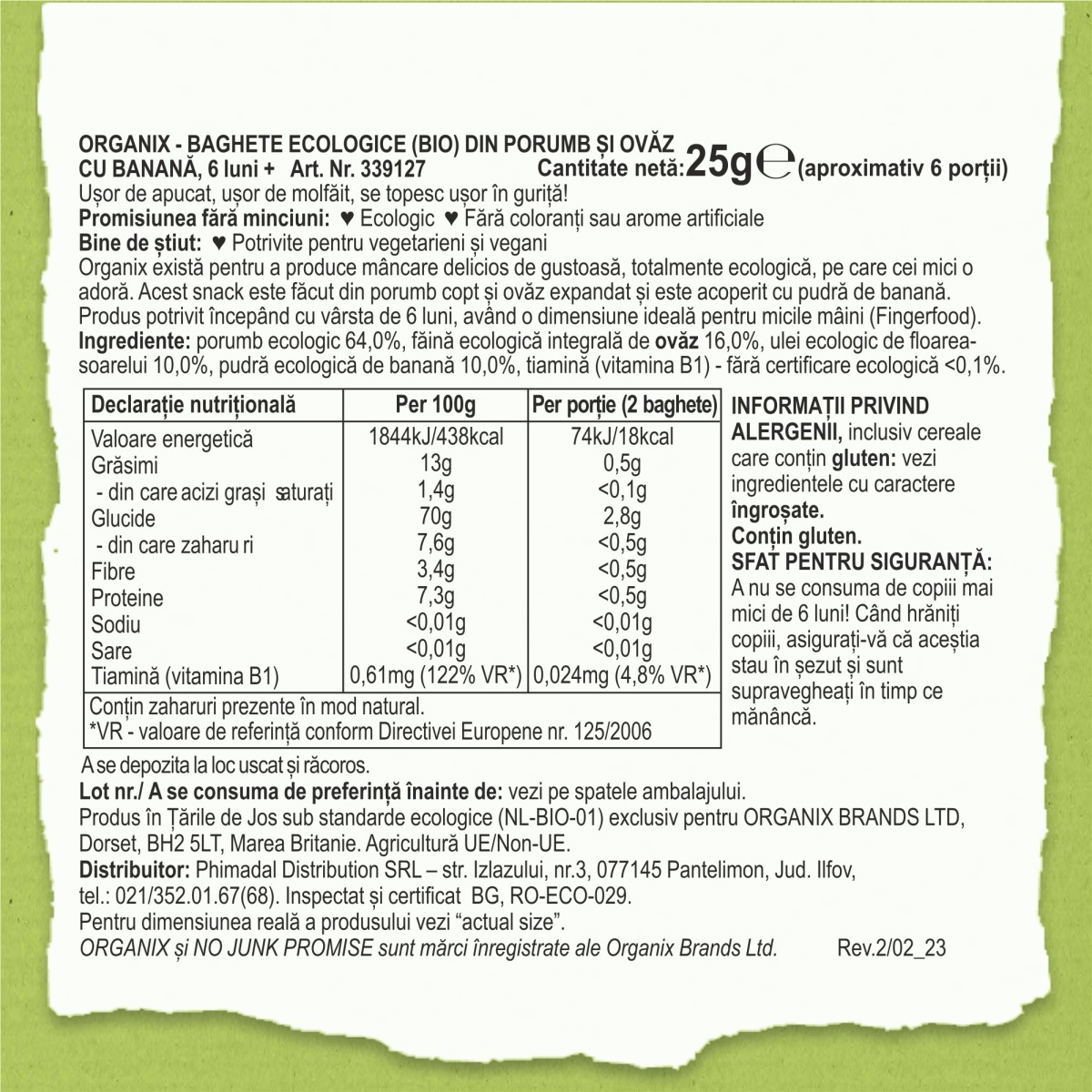 ORGANIX - SNACK BAGHETE ECOLOGICE (BIO) DIN PORUMB SI OVAZ CU BANANA, , 25G, 6luni+