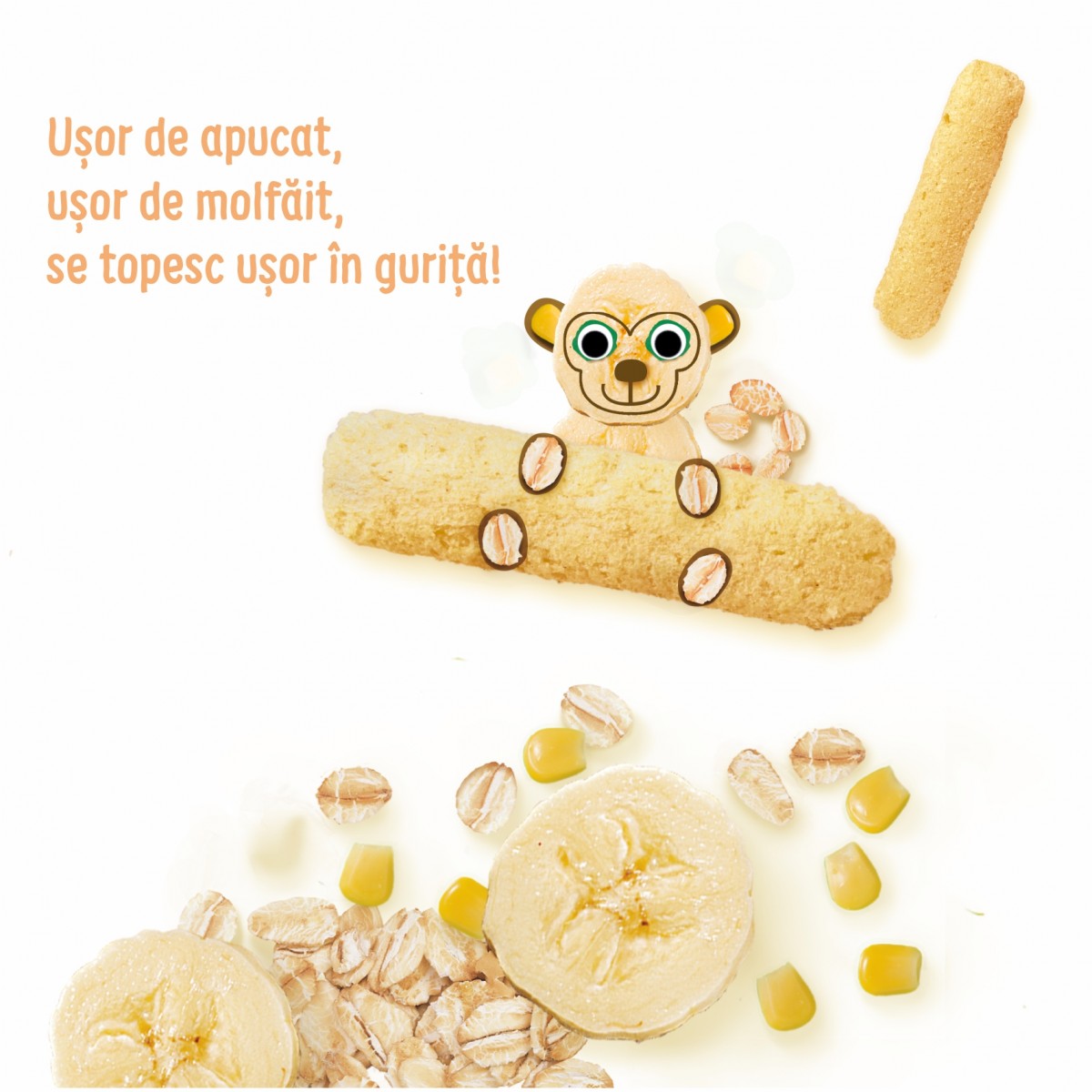 Aceste snack este facut din porumb copt si orez expandat si este acoperit cu pudra de banana. Produs potrivit începand cu varsta de 6 luni, avand o dimensiune ideala pentru micile maini (Fingerfood).