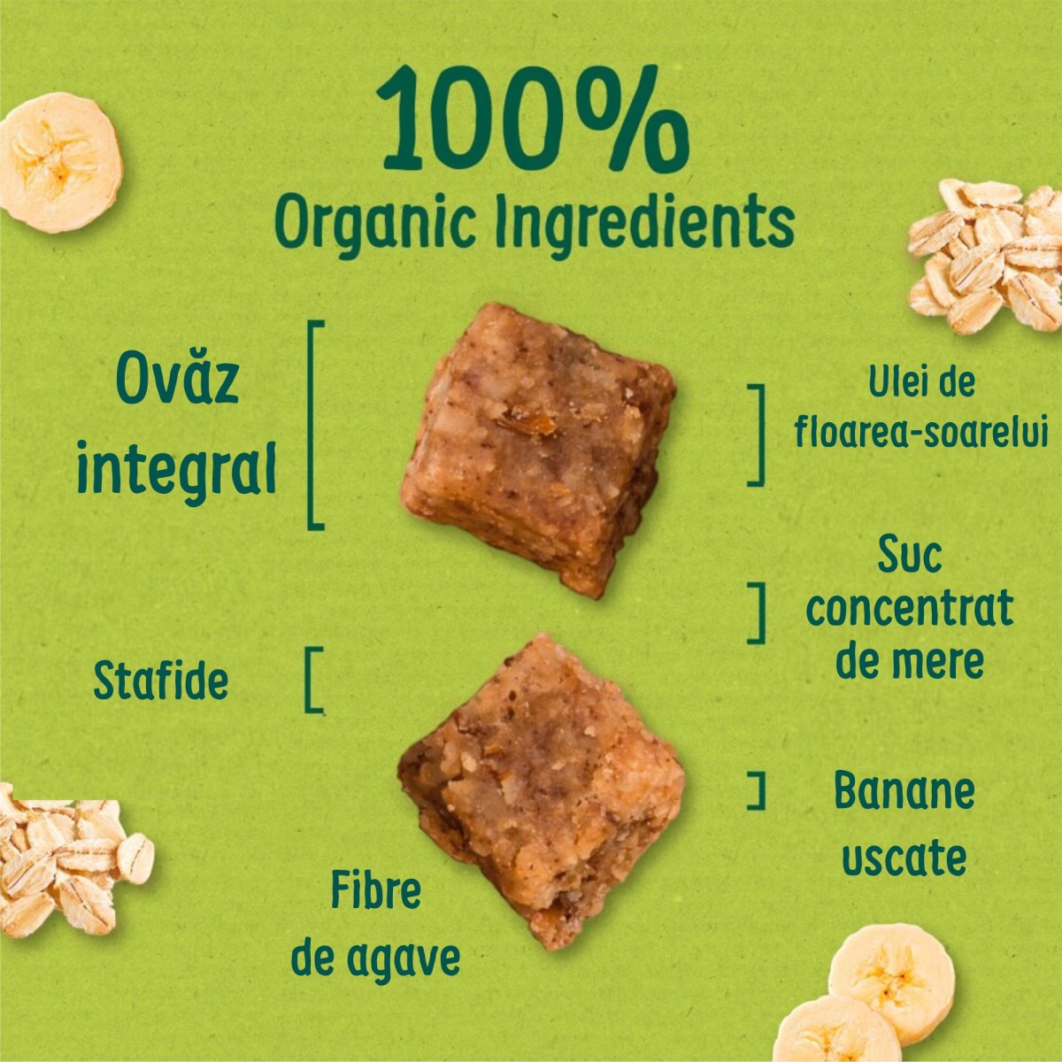Cubulețele sunt făcute dintr-un amestec de ovăz integral, stafide, suc de mere și banane uscate.
