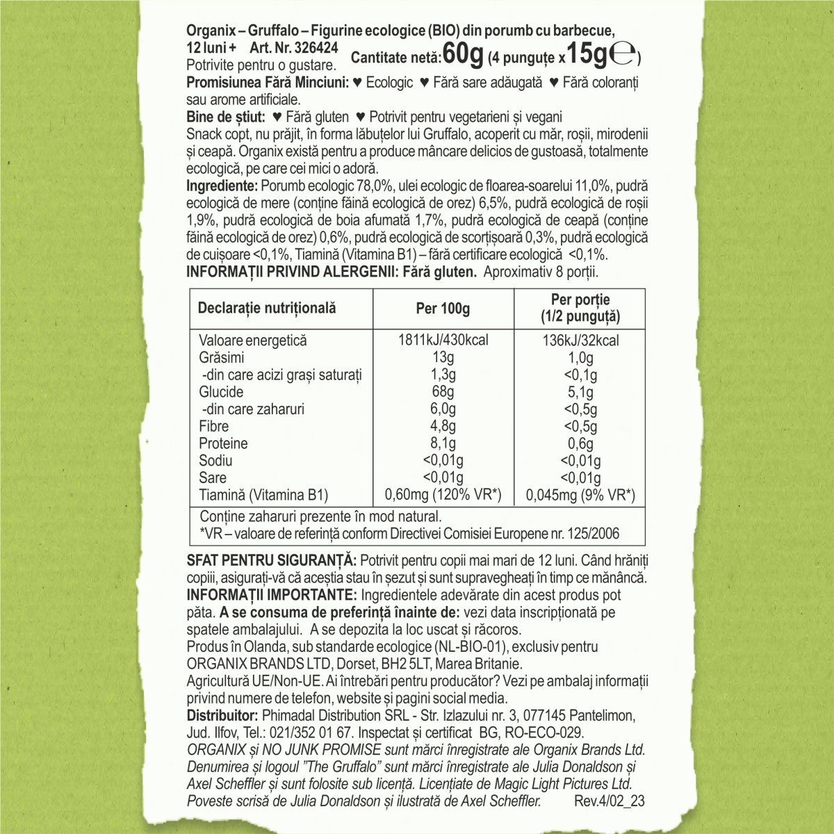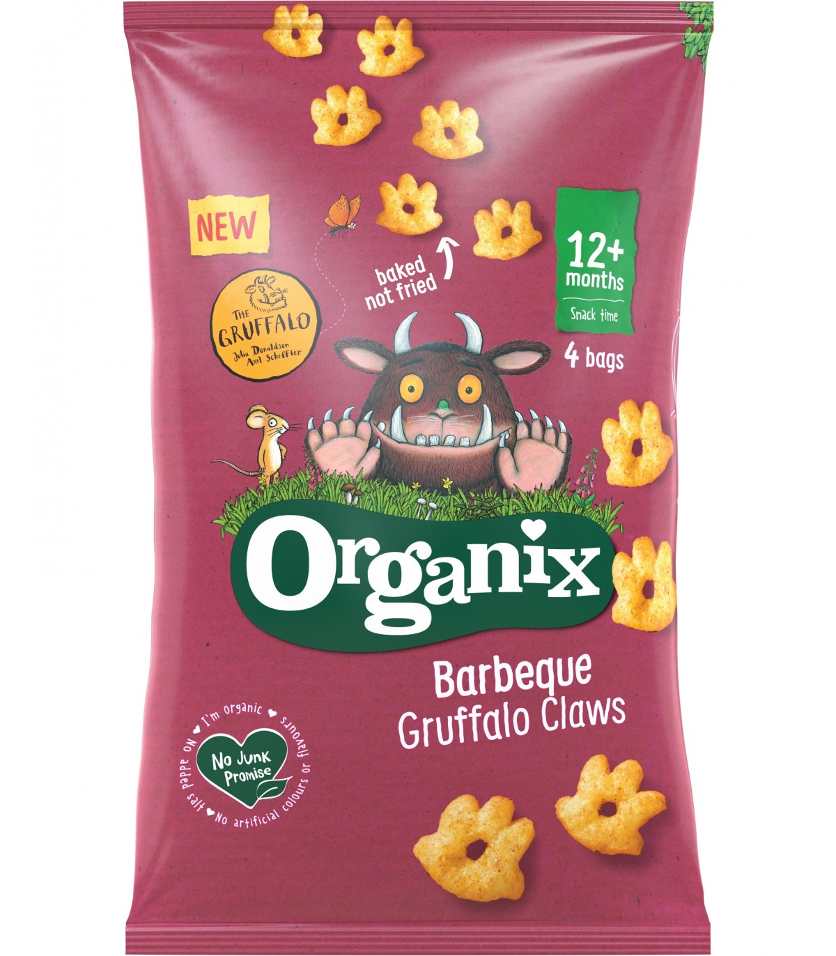 ORGANIX si NO JUNK PROMISE sunt marci inregistrate ale Organix Brands Ltd. Denumirea si logoul ”The Gruffalo” sunt marci inregistrate ale Julia Donaldson si Axel Scheffler si sunt folosite sub licenta. Licentiate de Magic Light Pictures Ltd. Poveste scrisa de Julia Donaldson si ilustrata de Axel Scheffler.