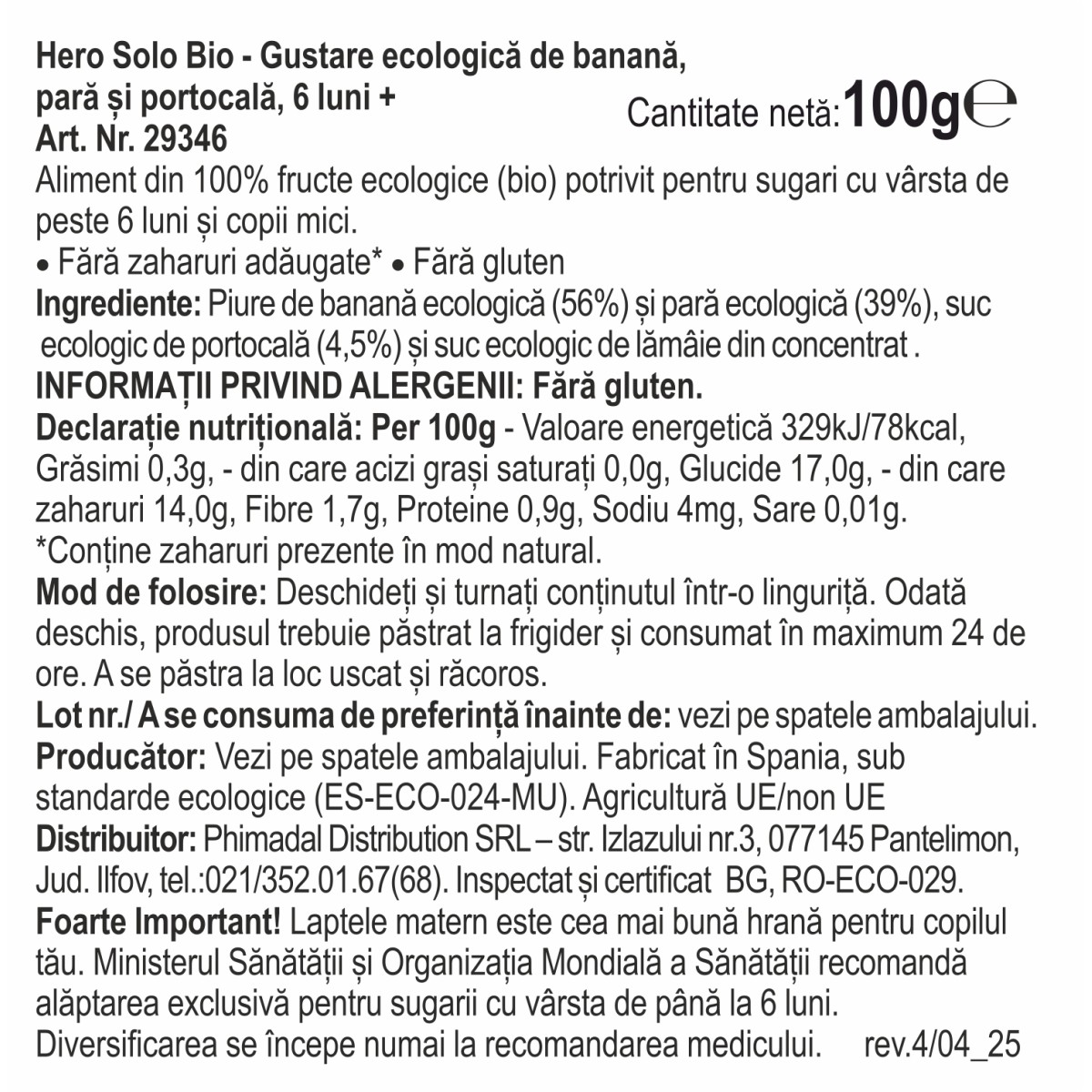 HERO SOLO BIO - Piure GUSTARE BANANA, PARA SI PORTOCALA, ECO, 100G, 4luni+
