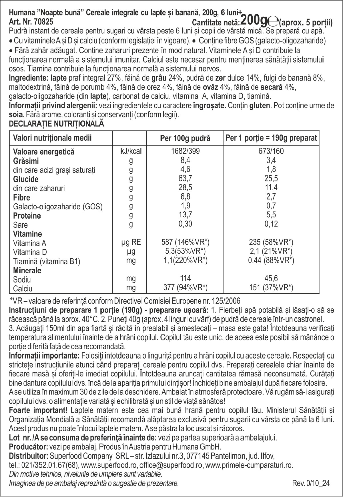 Ingrediente: lapte praf integral 27%, făină de grâu 24%, pudră de zer dulce 14%, fulgi de banană 8%, maltodextrină, făină de porumb 4%, făină de orez 4%, făină de ovăz 4%, făină de secară 4%,