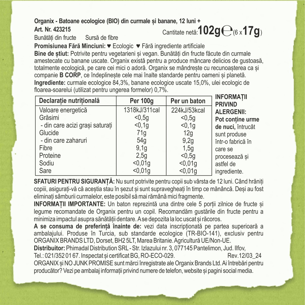Ingrediente: Curmale ecologice 84,3%, banane ecologice uscate 15%, ulei ecologic de floarea-soarelui (utilizat pentru ungerea formelor) 0,7%.