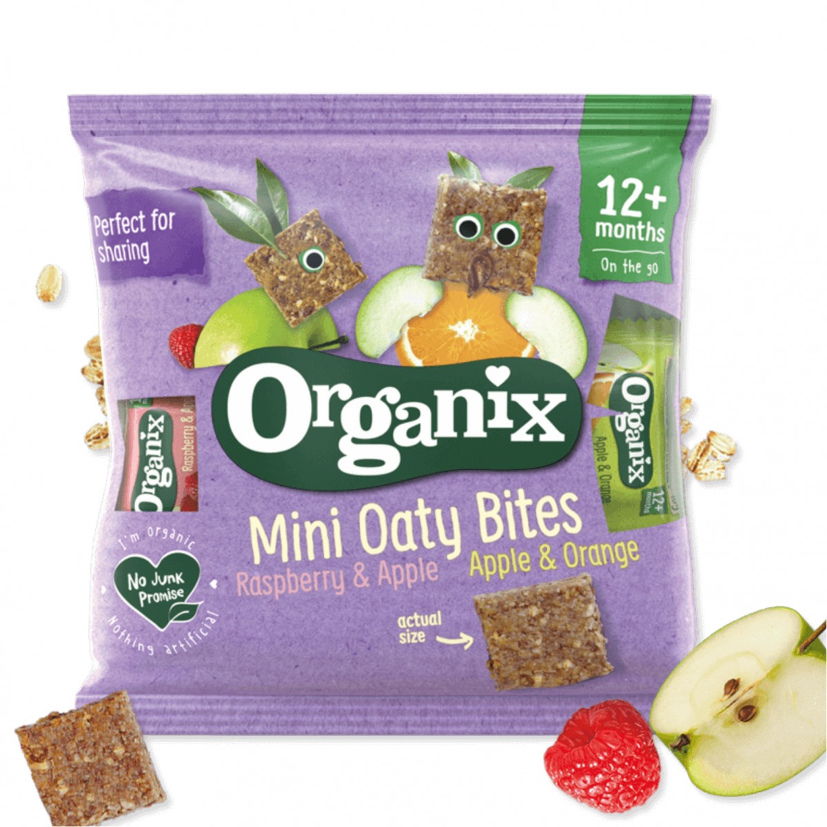 Organix - 2 tipuri de mini batoane ecologice (BIO) din ovăz integral cu mere & zmeură și mere & portocale, 12luni+