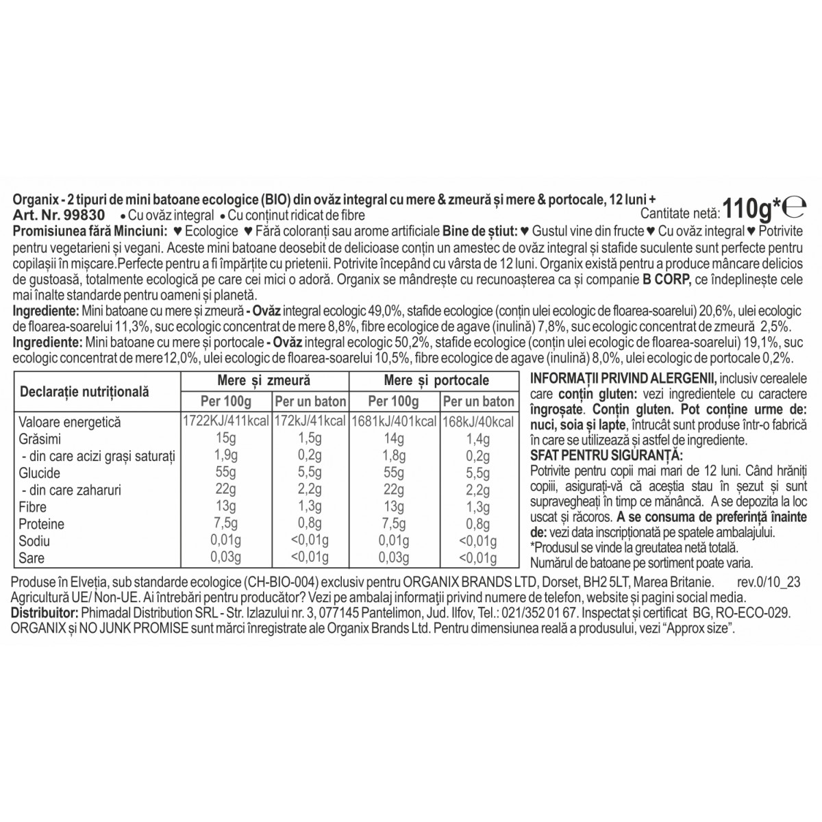 Produse în Elveția, sub standarde ecologice (CH-BIO-004) exclusiv pentru ORGANIX BRANDS LTD, Dorset, BH2 5LT, Marea Britanie.