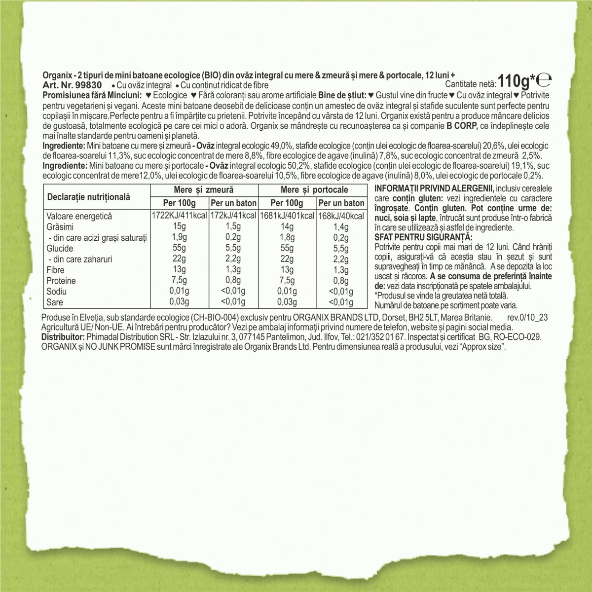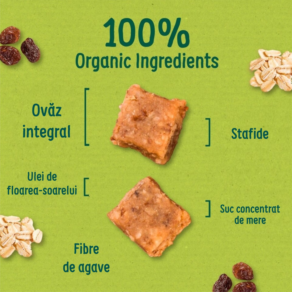 Ingrediente: Mini batoane cu mere și zmeură - Ovăz integral ecologic 49,0%, stafide ecologice (conțin ulei ecologic de floarea-soarelui) 20,6%, ulei ecologic de floarea-soarelui 11,3%, suc ecologic concentrat de mere 8,8%, fibre ecologice din agave (inulină) 7,8%, suc ecologic concentrat de zmeură 2,5%.