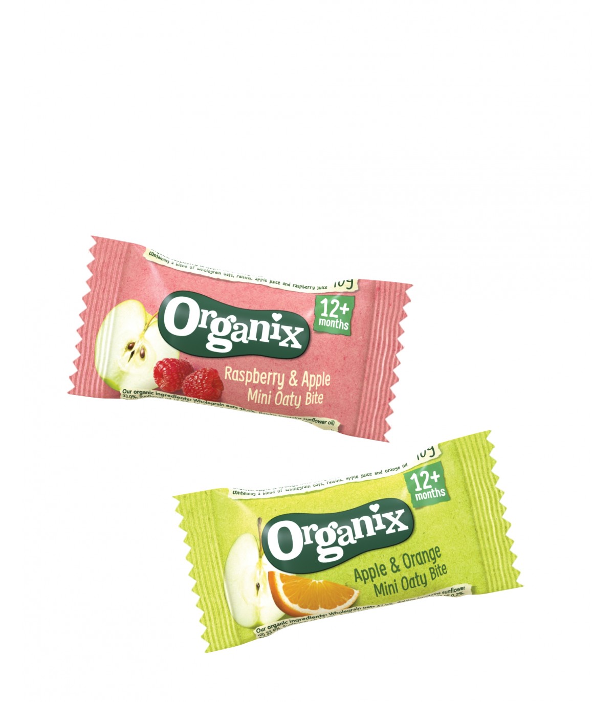 ORGANIX - MINI BATOANE ECOLOGICE (BIO) DIN OVAZ INTEGRAL CU MERE-ZMEURA SI MERE-PORTOCALE 110G, 12luni+