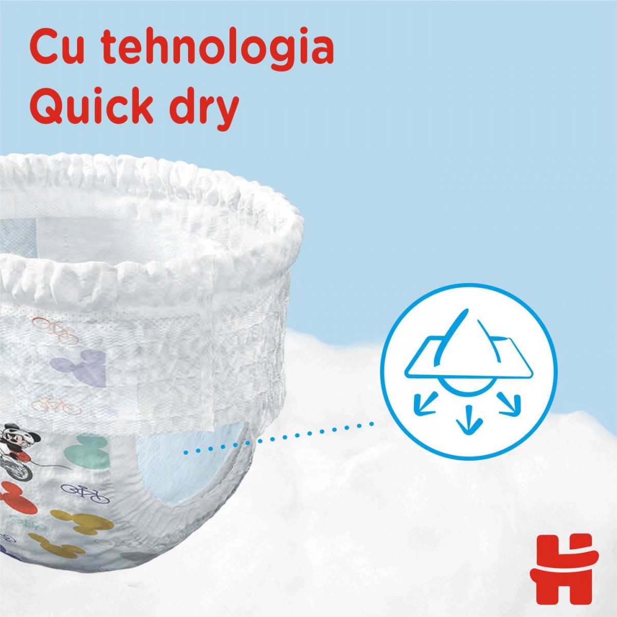 Chilotei-scutece Huggies Pants pentru baietei sunt conceputi tinand cont de caracteristicile anatomice special pentru baietei. Braul si laturile largi se intind in toate directiile, mansetele elastice din jurul picioarelor sunt destinate pentru o aderare mai stransa si confortul necesar in timpul miscarilor. Puteti sa ii puneti rapid si usor pe bebelusi - ca chiloteii obisnuiti. si la fel de usor sa ii scoateti - trebuie doar sa rupeti partile laterale. Indicatorul de umiditate va sopteste cand chiloteii trebuie schimbati