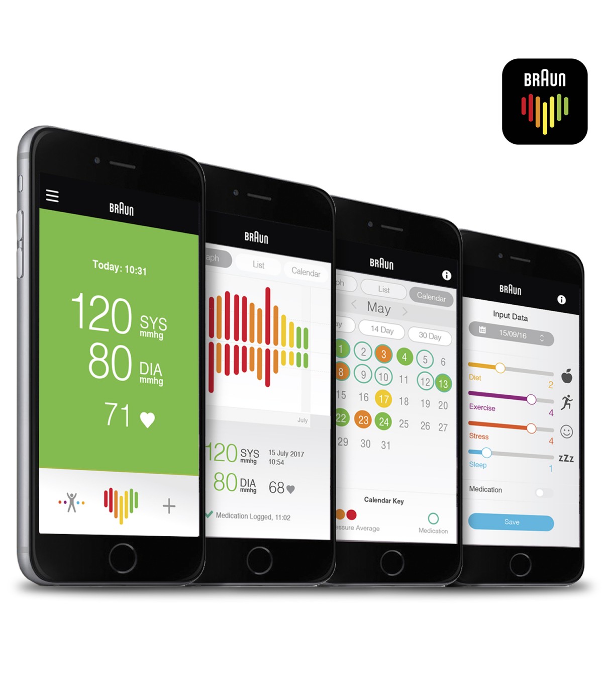Utilizati aplicatia Braun Healthy Heart, disponibila pe App Store si Google Play si urmariti-va evolutia in timp. Introduceti manual citirile de tensiune arteriala in aplicatie. Astfel, va puteti urmari variatia tensiunii arteriale. Adaptati-va stilul de viata si imbunatatiti-va valorile tensiunii arteriale.